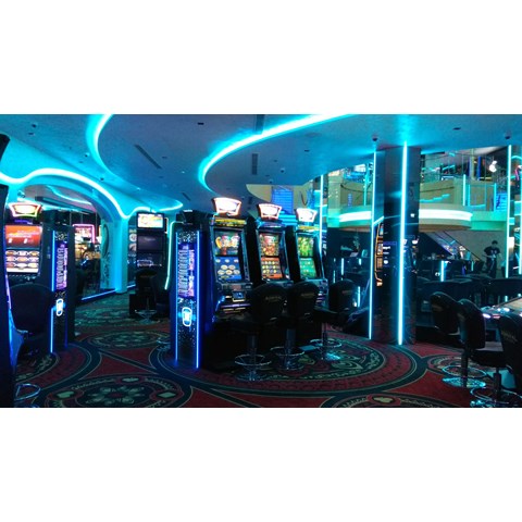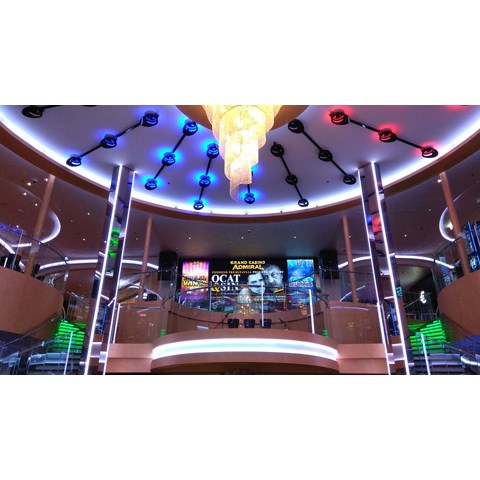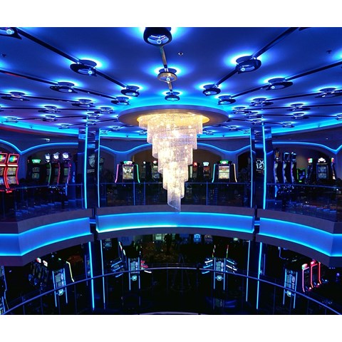Jego życzeniem było to, aby efekt końcowy dawał poczucie prestiżu i ekskluzywności. Estetyka miejsca nawiązywać miała do pozostałych obiektów sieci. Specjalnie do tej inwestycji zaprojektowaliśmy oprawy sufitowe PEACOCK, które zostały rozmieszczone na suficie wokół żyrandola. Ich ułożenie nawiązuje do kształtu pawiego pióra, a wielobarwny, dynamiczny ruch światła idealnie odtwarza magię kręcącego się koła ruletki.