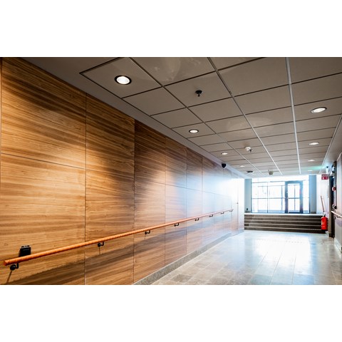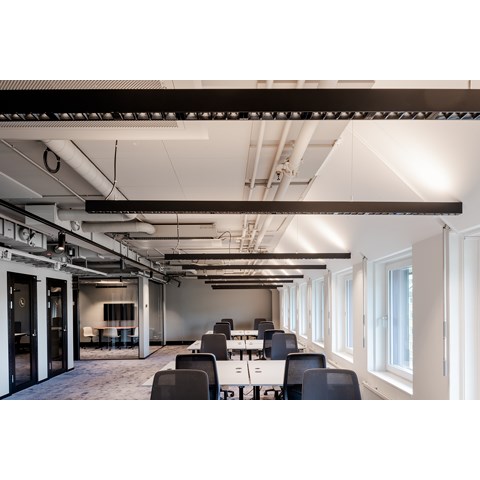 Glamox fick äran att leverera svarta pendlade FX45 med Linsoptik i olika länger, allt från 1m upp till 8m långa och ett stort antal svarlackade infällda downlights D70-R.