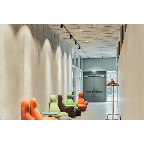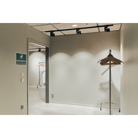 Downlight D70-R står för mycket av allmänljuset runt om i lokalerna – t ex i reception, gångstråk och allmänna utrymmen. Parallellt med allmänljuset, D70-R, finns spotlight S-90 runt om i lokalerna för att sprida ljus på väggar, tavlor och skyltar.