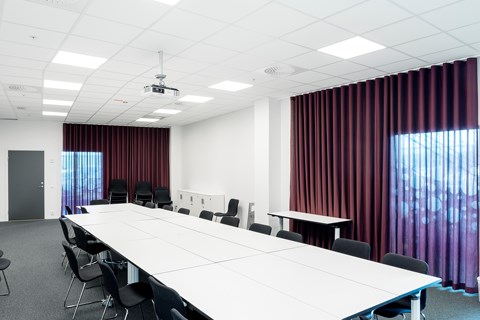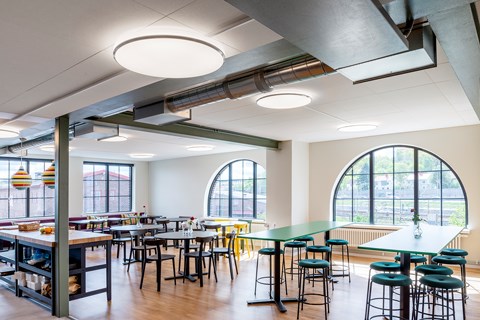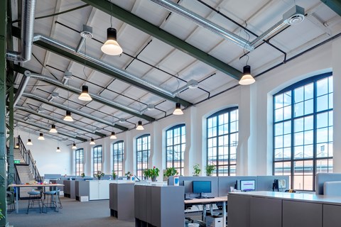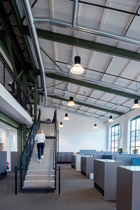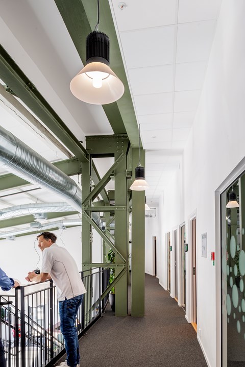 Karl Ljunggren berättar att hela fastigheten har utrustats med moderna energieffektiva lösningar vad gäller såväl uppvärmning som ventilation och belysning. Som armatur valdes bland annat A90-P från Glamox. ”Utöver rätt luxtal ville vi ha ett utseende som stämmer överens med vår vision om en industriell, avskalad känsla och valde en armatur som harmoniserar med detta”, säger han. Niclas Ljungblad, säljare på Glamox, berättar att man har levererat en belysning som värnar den historiska verksamheten. ”Vi var med ganska tidigt i projektet”, säger han. ”Tillsammans med City El & Data tog vi fram ett förslag med fokus på att bevara och lyfta fram fastighetens hårda industrilook. Resultatet blev en nedpendlad industriarmatur i form av A90-P som känns rå i sitt uttryck. Fastigheten har halkkonstruktioner som ger en ruff känsla och belysningen samspelar väl med dessa.”