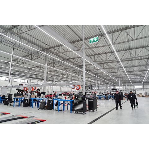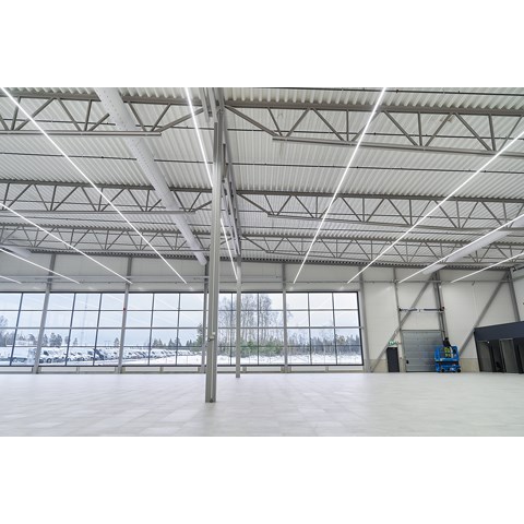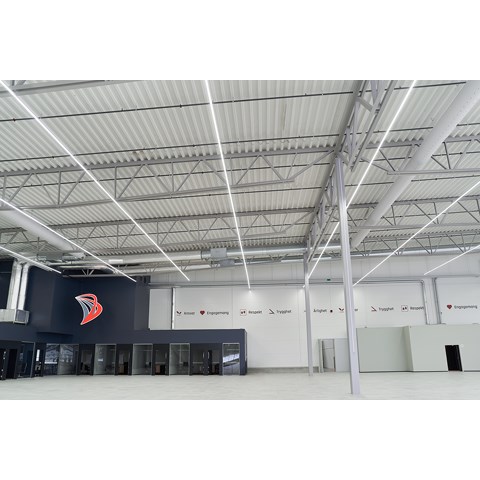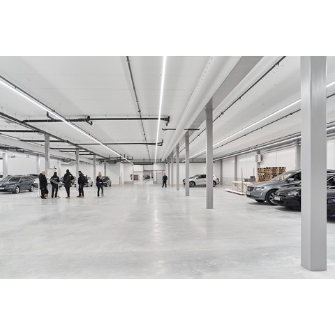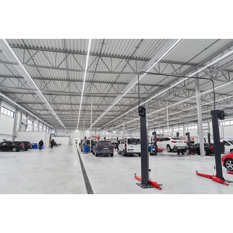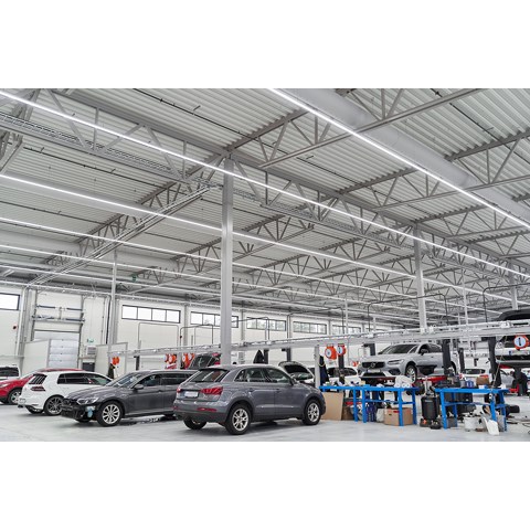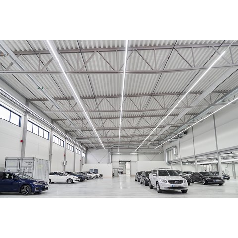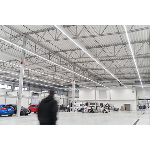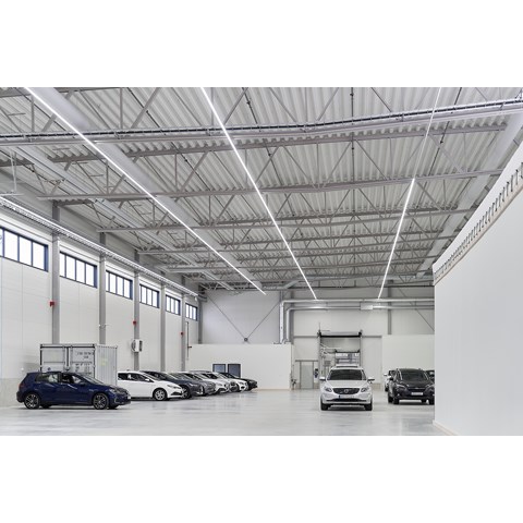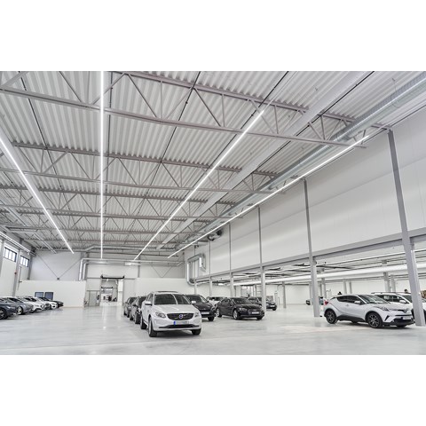 När det gällde att välja belysning till den nya anläggningen fanns det flera viktiga faktorer att ta ställning till. Belysningen skulle vara energisnål, näst intill underhållsfri – och den skulle kunna monteras så enkelt och snabbt som möjligt. I dom stora bilhallarna ville man ha långa lysande linjer av ljus.
