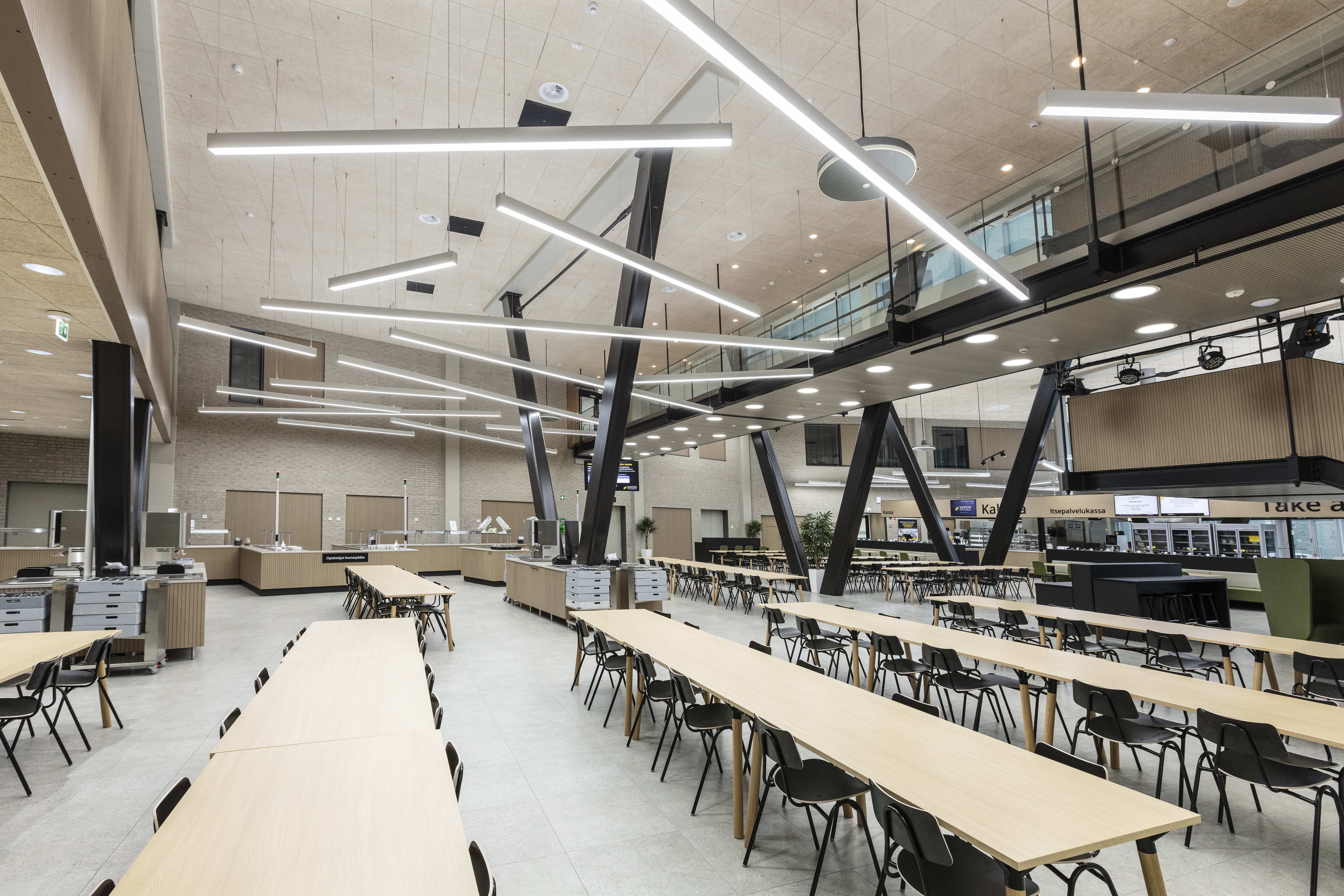 ”Inlärningslokalerna måste ibland kunna modifieras. Jämn belysning av lokalerna möjliggör flexibel placering av möblerna. Dimensioneringen av modularmaturerna följer måtten på takrutorna, vilket gör det möjligt att även flytta armaturerna vid behov, säger Kauppinen.