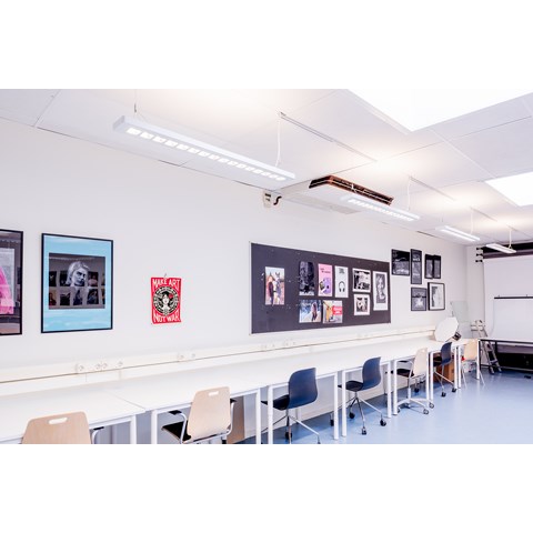 Nu föll valet på C77-P för allmänljuset i klassrummen. C77-P är en pendlad armatur från C77 familjen. Rätt belysning är avgörande för att säkerställa en bra inlärnlärningsmiljö och korrekt visuell komfort. Glamox C77 ger mer ljus och bättre djupseende, vilket skapar de rätta visuella förutsättningarna för inlärning i utbildningsmiljöer. C77-P kombinerar stor ljuseffektivitet med behagligt låga bländningsvärden med hjälp av reflektorteknik.