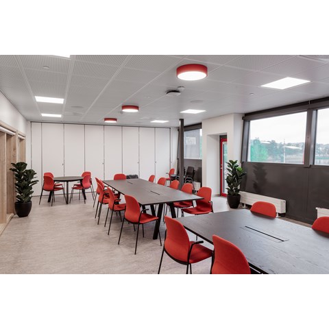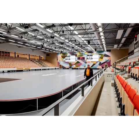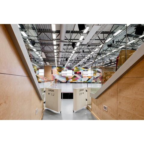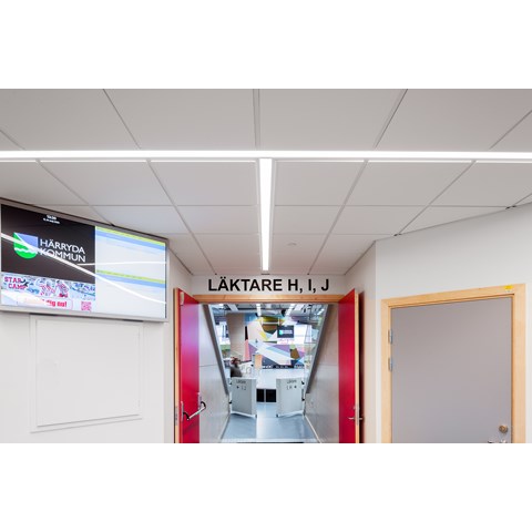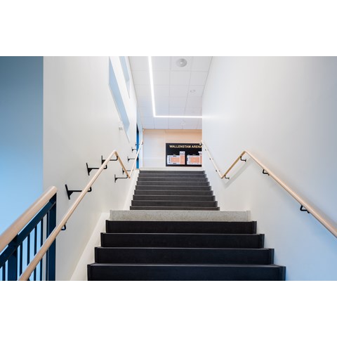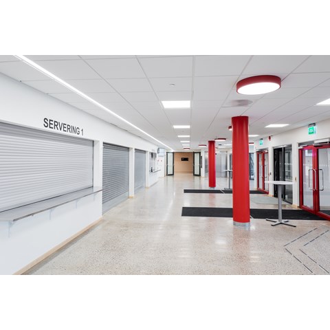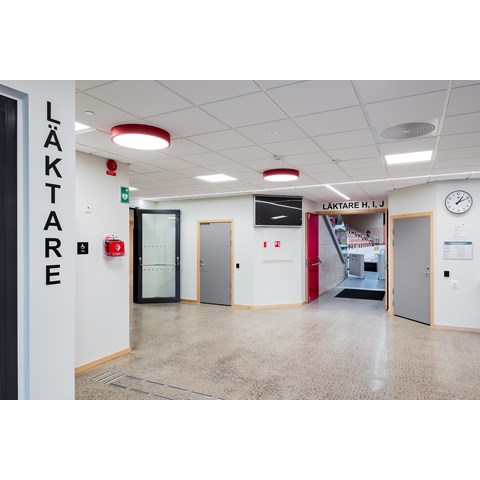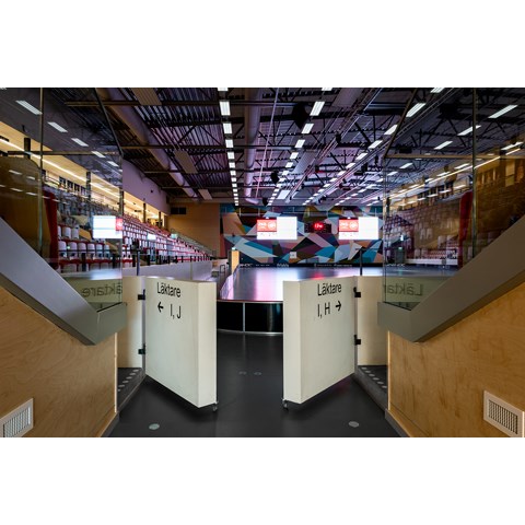 Långa linjer av ljus – Glamox C80-RR - infällda i taket visar vägen vid läktare, korridorer och entrén. Här samsas även den runda utanpåliggande armaturen Glamox C90-S i två olika storlekar lackerade i ”Wallenstams röd” färg.